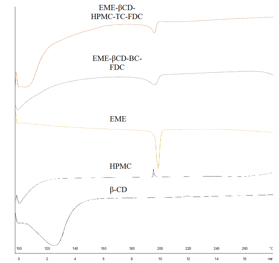 Fig. 7: DSC thermograms of β-CD, HPMC, EME, binary complex (EME-βCD-BC-FDC), and ternary complex (EME-βCD-HPMC-TC-FDC)