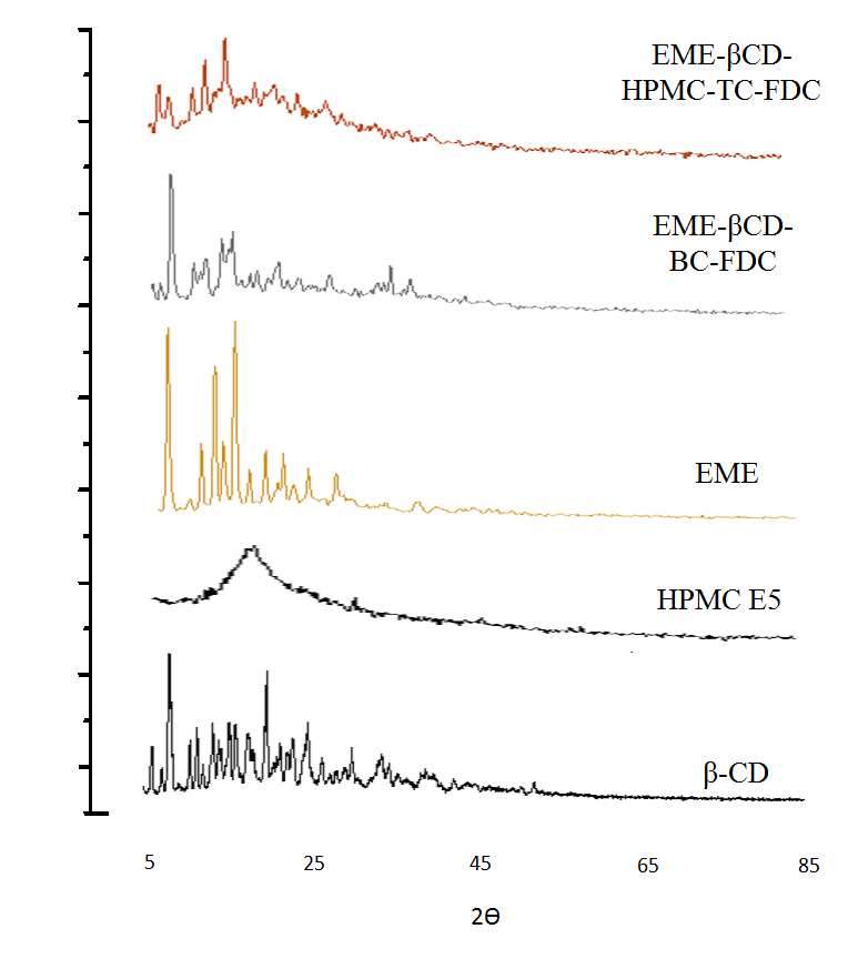 The PXRD patterns of β-CD, HPMC E5, EME, and their lyophilized binary and ternary formulations are shown in fig. 8. The partly crystalline structure of the cross-linked polysaccharide, β-CD, was demonstrated by a few strong peaks at 2Ѳ values of 5.1, 7.3, 17.6, and 23.2. The diffused X-ray diffraction pattern of HPMC E5 indicated its amorphous nature. Because of its strong crystalline nature, the diffractogram of EME showed distinct characteristic peaks at 2Ѳ values of 6.2, 14.6, 16.9, 18.1, and 24.5 [23]. The X-ray diffractogram of the lyophilized binary complex, EME-βCD-BC-FDC, revealed weak intensity diffraction peaks at 2Ѳ values of 6.2 and 14.5 which can be attributed to the reduced crystallinity of EME in a carrier, β-CD. Also, the ternary lyophilized formulation, EME-βCD-HPMC-TC-FDC, presented a nearly diffused diffraction pattern with a complete absence of distinct diffraction peak that confirmed a profound reduction in crystallinity of EME due to its engulfment in void β-CD. Thus, the PXRD data indicated that the prepared ternary formulation had a higher amorphous character than the binary one. The results of PXRD are in agreement with the DSC data, suggesting that the crystallinity of the freeze-dried formulations was significantly lower than that of the pure active ingredient, EME, and the drug was on the verge of transition to a completely amorphous state.