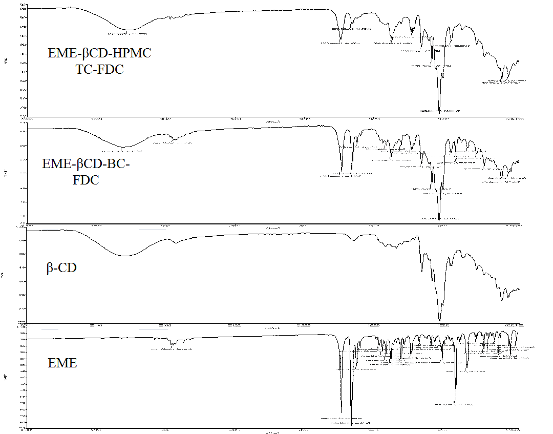 Fig. 10: FTIR spectra of EME, β-CD, binary and ternary systems, EME-βCD-BC-FDC, EME-βCD-HPMC-TC-FDC