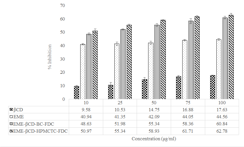 Fig. 12: Percentage inhibition values of β-CD, EME, EME-βCD-BC-FDC, and EME-βCD-HPMC-TC-FDC with respect to concentration (n=3, mean+SD)