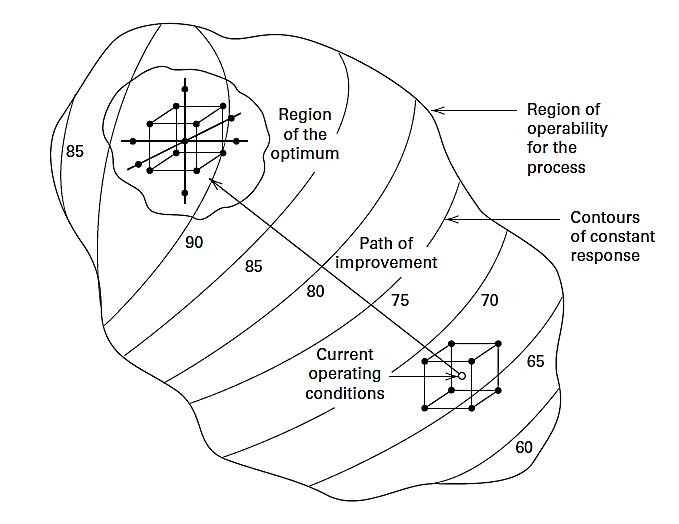Response surface methodology (RSM) is a method that is also known as the Box-Wilson Methodology. Surface methodology responses are a collection of statistical and mathematical techniques that are useful for modeling and analyzing problems where the response is influenced by various variables [4]. Response surface methodology connect a response or outcome variable (output) to the input data (input) that affect it. If an area with an optimum response is found, a model is made to connect to that area so that the analysis can be carried out to achieve the optimal area. In the use of RSM must be in sequence according to the procedure. When a physical event is far from the optimum point, the equation (1) is used. The optimization process with RSM can be seen in fig. 1.