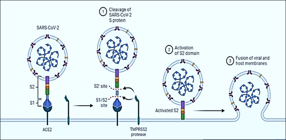 Coronaviruses are single-stranded RNA viruses responsible for respiratory, gastrointestinal and neurological problems in human beings and many other mammals such as cats, dogs, chickens, pigs, cattle and birds. The most prevalent of them are HCoV-229E (Human coronavirus 229E), OC43 (Organ Culture 43), NL63 (Netherland 63), and HKU1 (Hong Kong University 1) and all of them can cause symptoms of the common cold in immunocompetent patients. SARS-CoV-2 is the third coronavirus which has been spread worldwide over the last two decades, causing serious health issues in people [21]. SARS-Coronavirus-2 is likely to utilise receptor recognition processes similar to those used by previous virulent coronaviruses like SARS-Co-Virus, the pathogen that caused the SARS pandemic in 2003 [22]. The spike protein of the coronavirus aids virus entrance into target cells. The SARS-CoV spike component and the SARS CoV-2 spike subunit both use ACE2 (angiotensin-converting enzyme 2) as an entrance receptor (fig. 5) [23]. Additionally, cell entry needs the cellular serine protease TMPRSS2 or other proteases which activate the spike protein [24]. For this entrance procedure to be completed, ACE2 and TMPRSS2 must be co-expressed on the cell surface. Furthermore, as evidenced by investigations of SARS-CoV, the virus's ability to attach to ACE2 is a major factor in transmissibility [25]. Recent research has found that SARS-CoV-2 has a stronger affinity for ACE2 when compared to SARS-CoV, which could help to explain the increase in the transmissibility SARS-CoV-2 [26, 27].