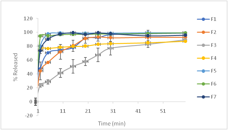 Fig. 1: In vitro dissolution profile of prepared levetiracetam ODTs, Data are represented as mean±standard deviation (n=3)