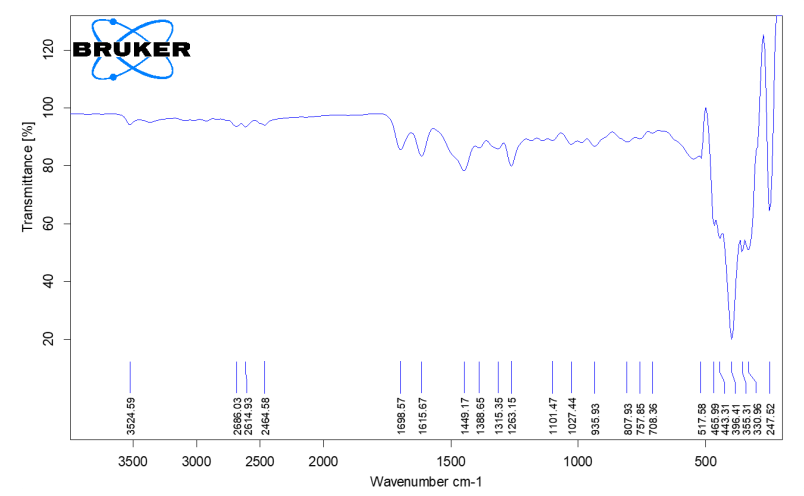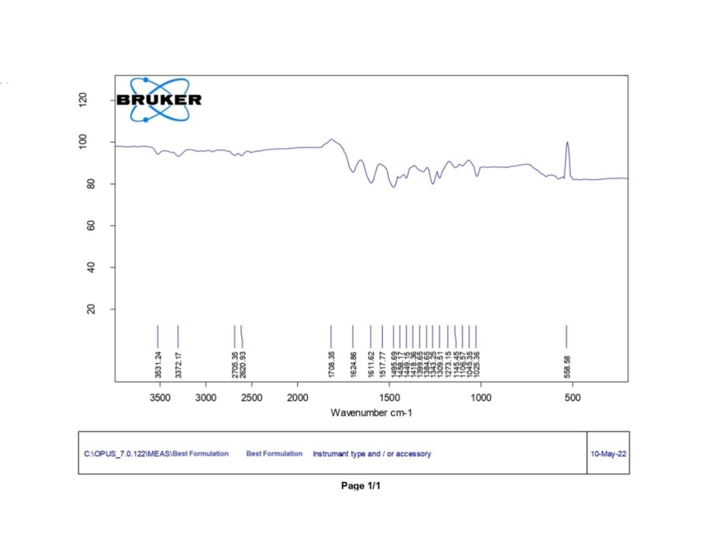 FT-IR spectroscopy estimates and determination of the pure drug and polymer were performed by utilizing infrared spectroscopy [12]. IR spectroscopy by Potassium Bromide (KBr) pellet methods was done on medication, polymer andphysical blend of medication [13]. Around 2 mg of each sample was triturated properly with pre-dried KBr for 30 min at 120 °C. The mixture is evenly mixed with the drug as well as placed in a holder and compressed under pressure in a hydraulic press to form pellets and further scanned at 4000-400 cm-1 in a spectrophotometer and the peak was obtained were recorded and shown in graph [14].