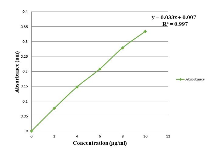The estimation of the drug was done by spectrophotometric technique. For the determination of λmax 25 mg drug was dissolved in the 0.1N HCl buffer solution. From this solution, 1-10µg/ml concentration was prepared and was scanned in the range of 200-400 nm utilizing a double beam UV-spectrophotometer [18]. In this, peaks were observed at 272 nm. Since the analytical wavelength mentioned for the drug in pharmacopeia was about 272 nm, so the wavelength of 272 nm was selected and used for further quantitative examination [19].