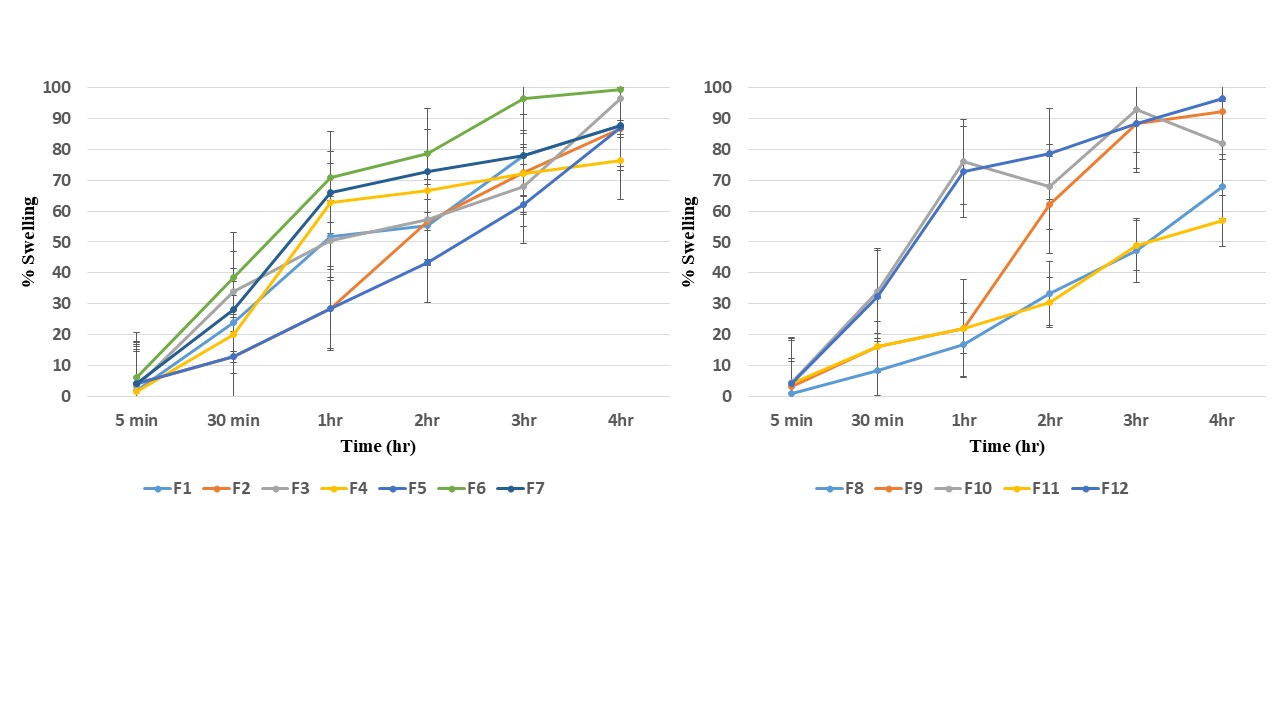 FLT and TFT help in determining floating studies. This was determined using 100 ml of HCl solution (pH 1.2) stored at 37±0.5 °C in a glass beaker [33, 34]. The total time during which the tablet continued to float in the dissolution medium is indicated by the TFT [35, 36]. While the time required for the tablet to come up from the bottom to the dissolution medium surface is indicated by the FLT. Tests were taken in triplicate [37, 38].