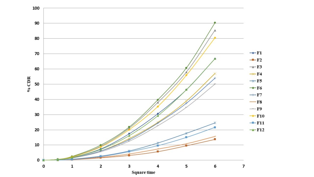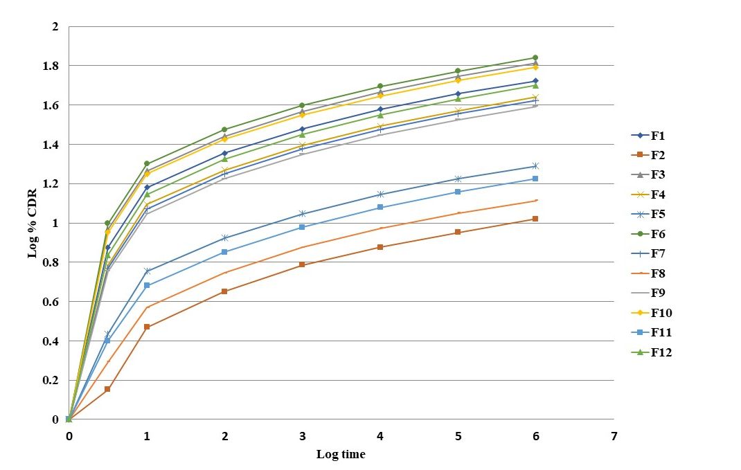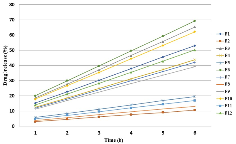 Fig. 5: Cumulative (%) drug release of different formulations, number of experiments n=3), error bars were omitted