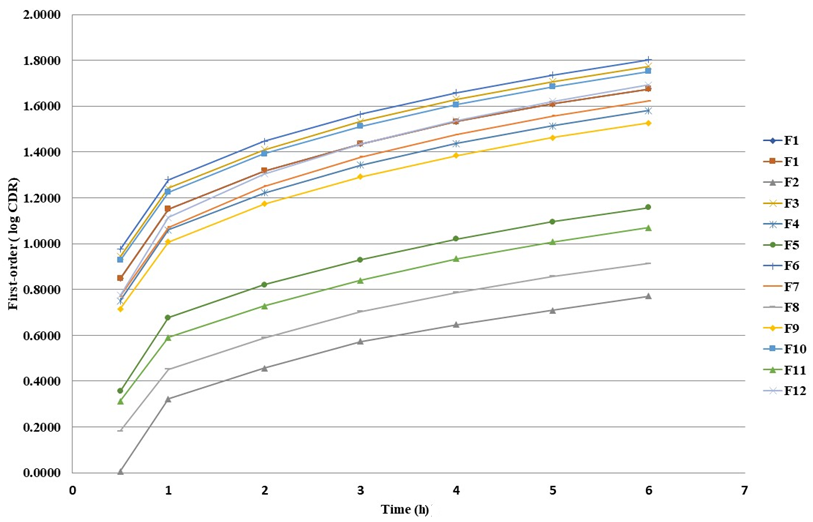 The drug release via the first-order condition was communicated as log aggregate level of medication versus time. The condition might be as per the following equation: