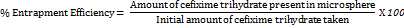 The entrapment efficiency of microspheres was determined by dispersing the weighed quantity of drug-loaded microspheres in 5 ml of methanol, sonicating the dispersion for 2 min and the volume made up to 100 ml with 0.1 N HCl. The solution was appropriately diluted at 0.1 N HCl in the range of 0 to 100 µg/ml and analyzed on a UV-visible spectrophotometer (model No-1700, Shimadzu) at 283 nm. The entrapment efficiency of microspheres was determined by using the following formula [18].