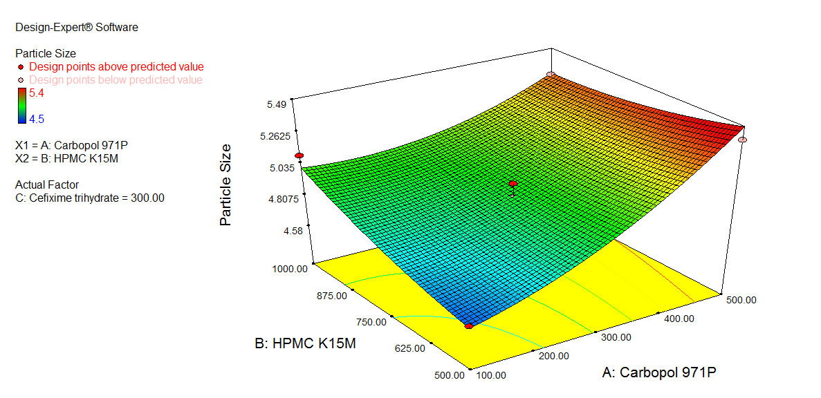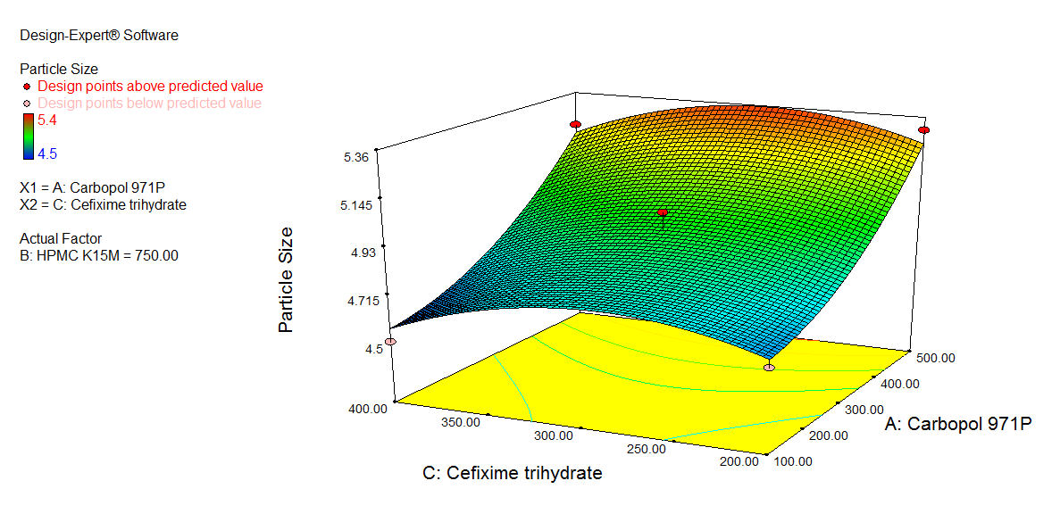 Fig. 1: Three-dimensional response surface plot showing (A) the effect of cefixime trihydrate and carbopol 971 P concentration on particle size, and (B) the effect of HPMC K15M and carbopol 971P concentration on particle size
