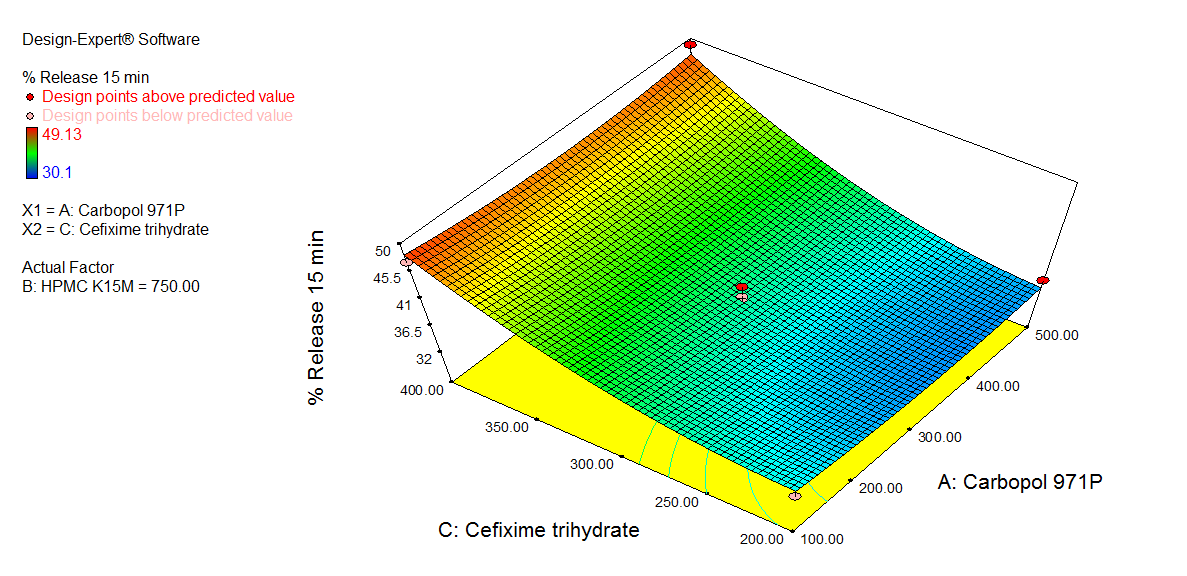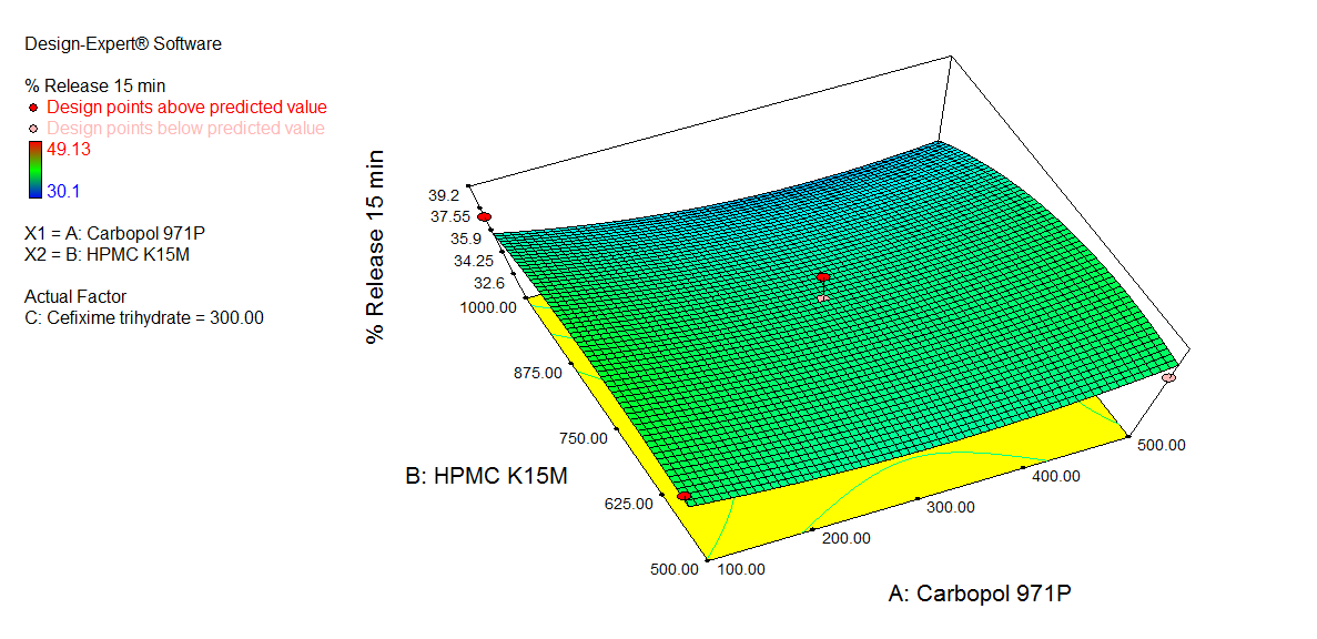 Fig. 2: Three-dimensional response surface plot showing (A) the effect of HPMC K15M and concentration on % release in 15 min, (B) the effect of cefixime trihydrate and carbopol 971P concentration on % release in 15 min