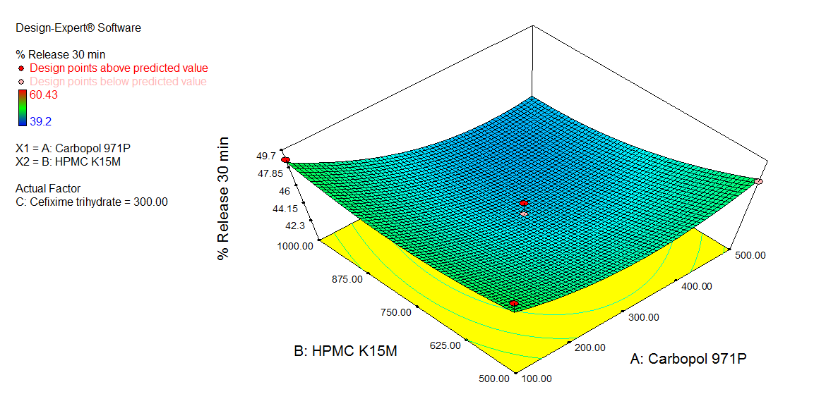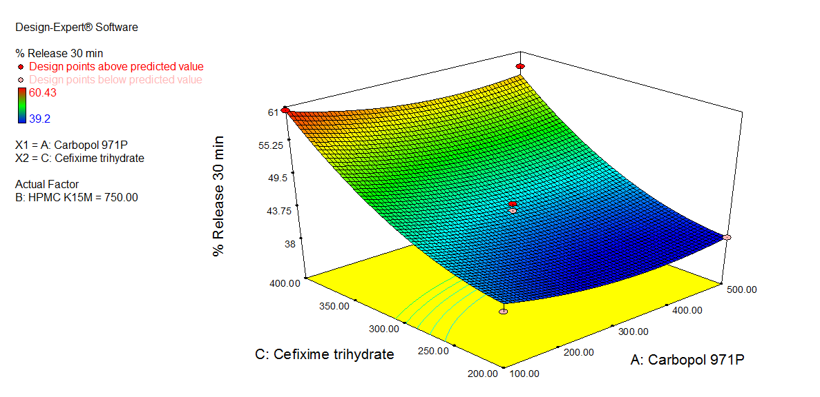 Fig. 3: Three-dimensional response surface plot showing (A) the effect of Carbopol 971P and HPMCK15M concentration on % release in 30 min, and (B) the effect of cefixime trihydrate and Carbopol 971P concentration on % release in 30 min