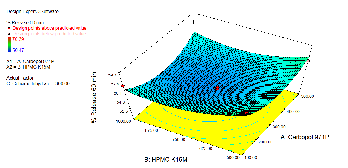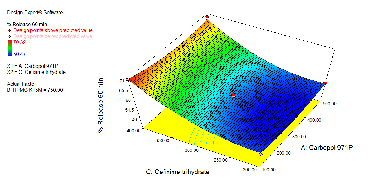 Fig. 4: Three-dimensional response surface plot showing (A) the effect of Carbopol 971P and HPMCK15M concentration on % release in 60 min, and (B) the effect of cefixime trihydrate and Carbopol 971P concentration on % release in 60 min