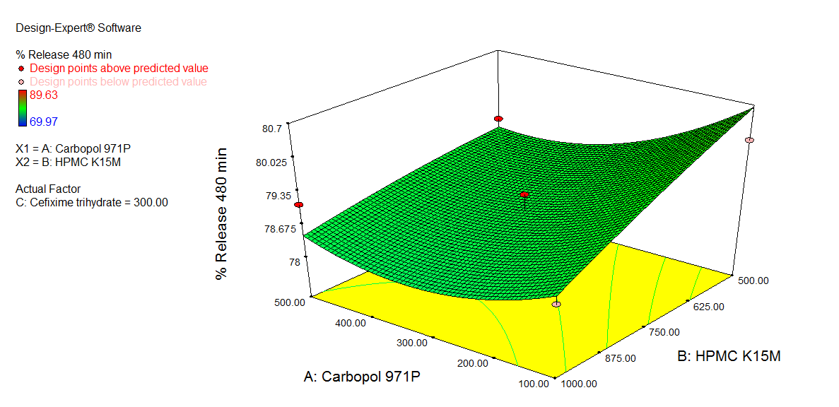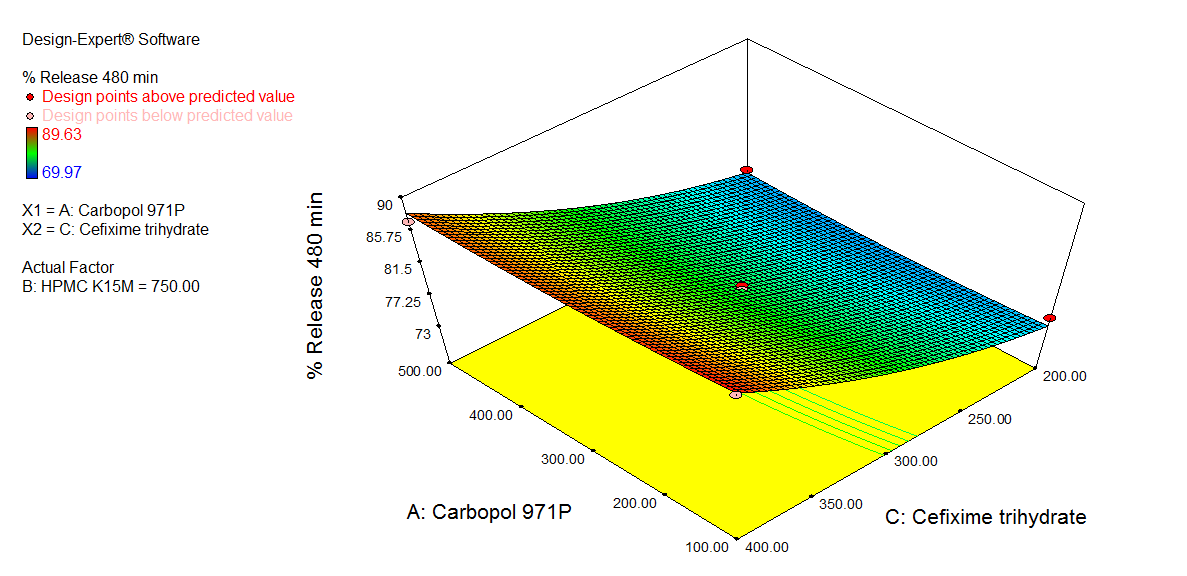Fig. 5: Three-dimensional response surface plot showing (A) The effect of carbopol 971P and HPMCK15M concentration on % release in 480 min, (B) The effect of cefixime trihydrate and carbopol 971P concentration on % release in 480 min