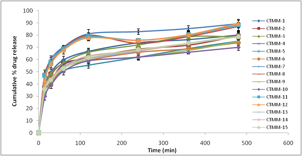 Fig. 6: Cumulative % drug release v/s time plot of cefixime trihydrate mucoadhesive microspheres optimization batches. All values shown in the graph are measured as mean±SD, n=3, Error bars indicate the standard deviation of replicates
