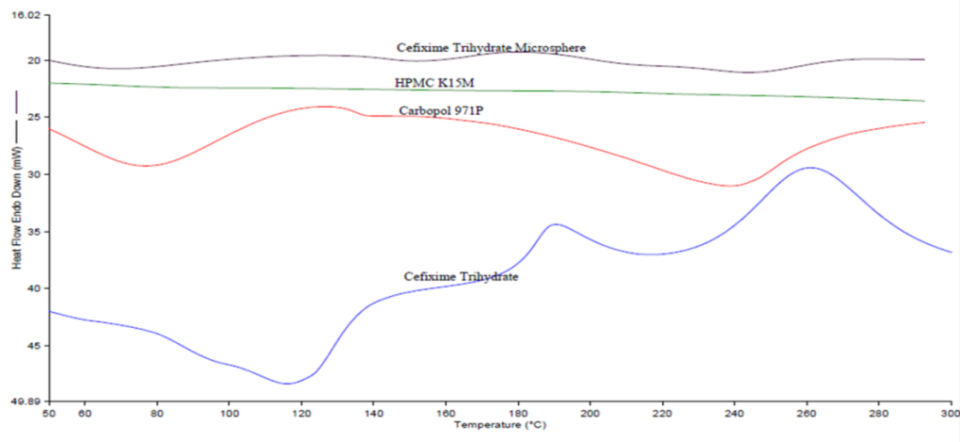 To check the physical parameters of cefixime in the microspheres, differential scanning calorimetry (Perkin Elmer 6000) was performed. The study enables us to determine whether the drug is completely entrapped and uniformly distributed throughout the microparticle forming solid dispersion. During the current work approximately weighed amount of 3 mg samples (Drug-cefixime trihydrate, Polymers-HPMC K15M and Carbopol 971P0, Microsphere formulation) were placed in an aluminium pan and crimped for DSC analysis. The samples were heated from 50 °C to 150 °C at a scanning rate of 20 °C/min under nitrogen flow (20 ml/min) [19].