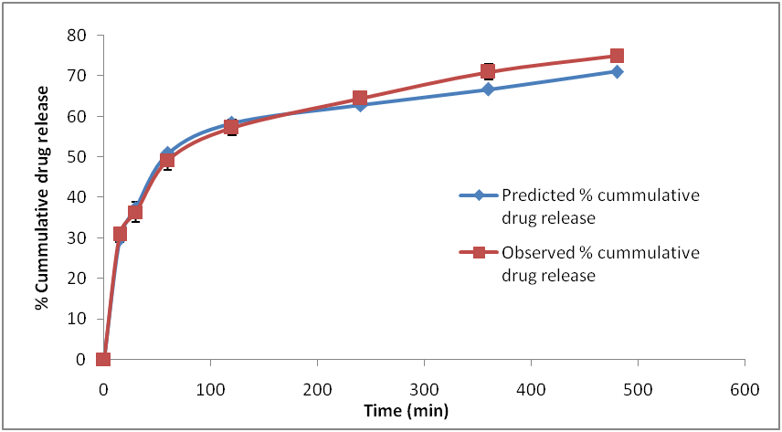 Fig. 11: Release profile of predicted and observed formulation of cefixime trihydrate mucoadhesive microspheres. Data are expressed as mean±SD, n = 6