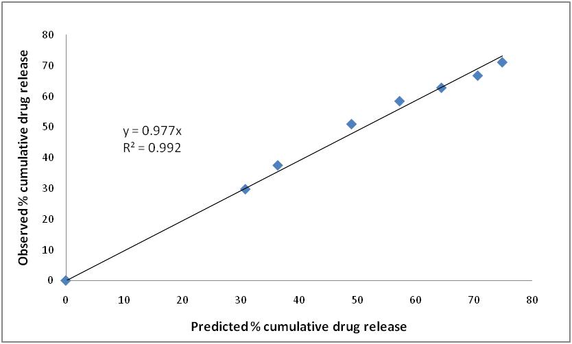 Fig. 12: Linear plots between observed and predicted values of % cumulative drug release