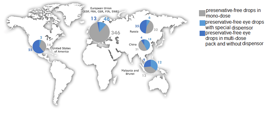 According to the analysis of local and international state registries of registered medicines, the share of ophthalmic preparations that do not contain preservatives averages 20.0%. Among European countries, the leader in the transition to preservative-free eye drops is Sweden (38.7%). On average, the proportion of preservative-free products registered in the European Union is higher than in the USA, Asia and Africa.