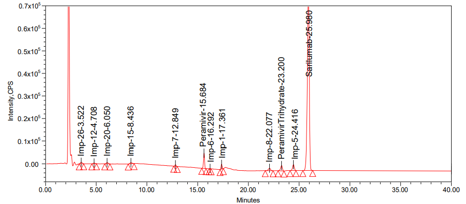 Methods: Optimized (Developed) method includes gradient elution of peramivir and its related substances with a flow of 1 ml/min and waters X-bridge C18 column of dimensions 150 mmx4.6 mm, 3.5µ. 0.1% formic acid and acetonitrile were used as the mobile phase. Sarilumab was used as an internal standard. 40 min run time was used to separate peramivir and its related substances.