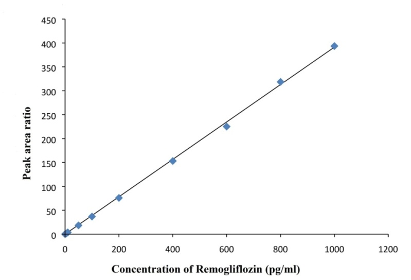 The linearity of REMO was evaluated in the series of 5 pg/ml–1000 pg/ml concentrations, respectively. Calibration curve of REMO was plotted by plotting peak area ratios (analyte peak area/internal standard peak area) against the different concentrations of analytes. The linearity was checked by linear regression analysis using 1/x as weight.