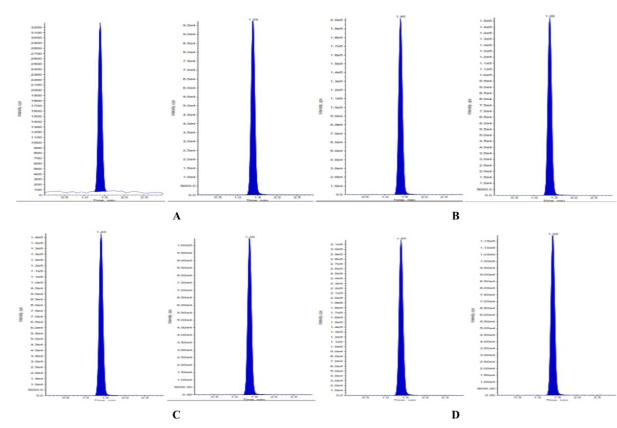 Fig. 5: Chromatograms of A) LLOQ B) LQC C) MQC D) HQC