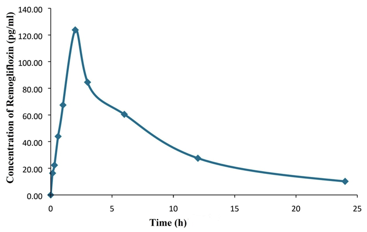 The established and validated bio-analytical approach was productively applied to study the pharmacokinetics following oral administration of 10 mg per kg body weight to twenty rats [20, 21]. The average plasma quantity Vs time profiles subsequent to oral dose administration of REMO are depicted in fig. 6. From the curve it was found that REMO was detected up to 24 h after dosing. All plasma concentrations of Analyte were within the standard curve region and above 5 pg/ml (LOQ) throughout the sampling period. The method was adequate during the 24 h sampling period to determine the plasma concentration profile of REMO.