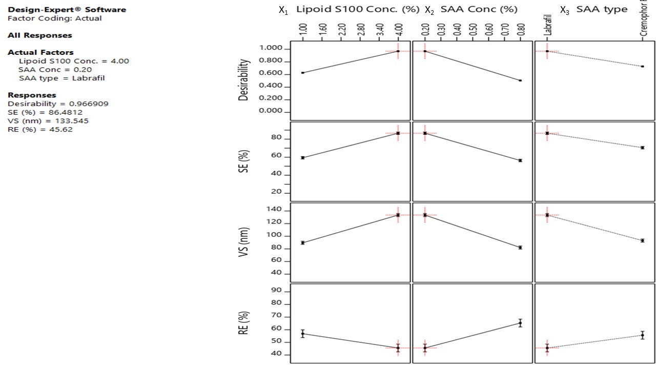 Fig. 1: Independent formulation variables effect (X1: Lipoid S100; X2: SAA conc. and X3: SAA type) on solubilization efficiency (%SE), vesicle size (VS), and release efficiency (%RE) beside the overall desirability (results were expressed as mean±SD, n=3)