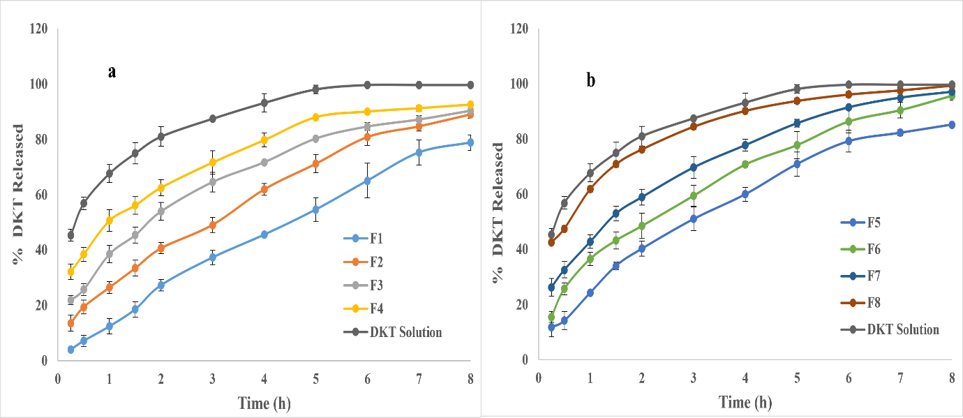 Fig. 2: In vitro release graphic illustration of DKT from TEs (a): Labrafil; (b): Cremophor (results were expressed as mean±SD, n=3)