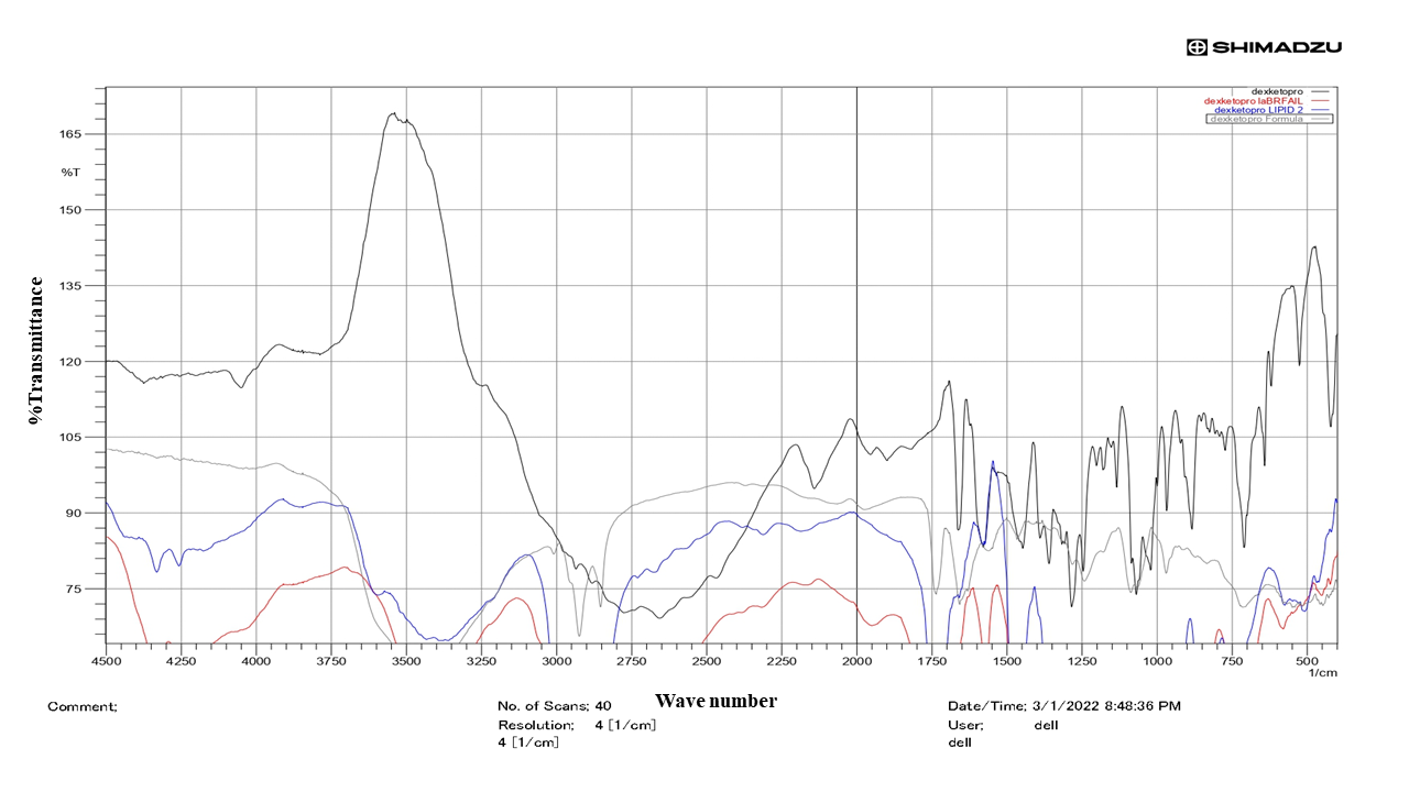 Fig. 4 displayed FT-IR spectra for DKT, lipoid, labrafil, and optimum formula (F1). The characteristics peaks for DKT occur at 1600 cm−1 and 1650 cm-1accredited to carbonyl vibrations; the benzopyran ring has alluded to 860 cm-1 and 690 cm-1. Additionally, (fig. 4) displayed spectra for F1 where characteristic peaks were deprived of fluctuation, therefore indicating the absence of interaction between DKT and TE components [5].