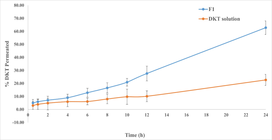 Fig. 5: Ex-vivo DKT permeation profile from the optimum TE formulation (F1) and DKT solution (results were expressed as mean±SD, n=3)