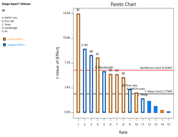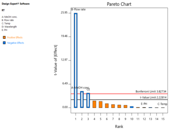 Response surface methodology (RSM) is used for exploring problems where several independent variables, such as mobile phase composition, flow rate, and wavelength, affect critical responses like retention time, peak area, theoretical plates, and tailing factor. The levels of different variables are optimized to attain the best system performance. In the experimental design, quadratic models can accurately explain all the response values of the chromatographic conditions. For the calculation of quadratic regression model coefficients, each variable having at least distinct levels must be studied to calculate quadratic regression model coefficients, and thus a Central Composite Design (CCD) was employed for optimization.