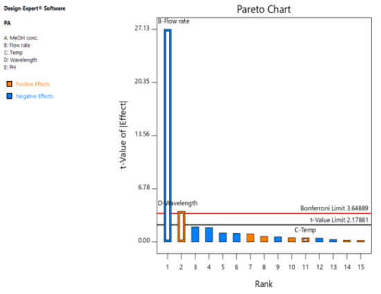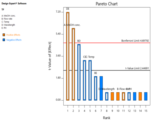 A two-level five-factor fractional factorial design was employed for factor screening studies to identify the critical method parameters/critical process parameters (CMPs/CPPs). These are considered as critically affecting analytical attributes (CAAs), like retention time (RT), peak area (PA), theoretical plates (TP), and tailing factor (TF). Table 1 depicts the design matrix enlisting the studied factors and the decoded translation of their respective low (-1) and high (+1) levels. A total of sixteen experimental runs were performed, and the design was analyzed for understanding the significance of factors on the CAAs. Mathematical data analysis was performed by fitting the obtained experimental data to the linear polynomial model by obviating the interaction term(s). As screening is primarily based on the principle of factor sparsity, the half-normal plot and Pareto charts were employed for quantitative identification of the effect of each factor on the selected CAAs [29-32].