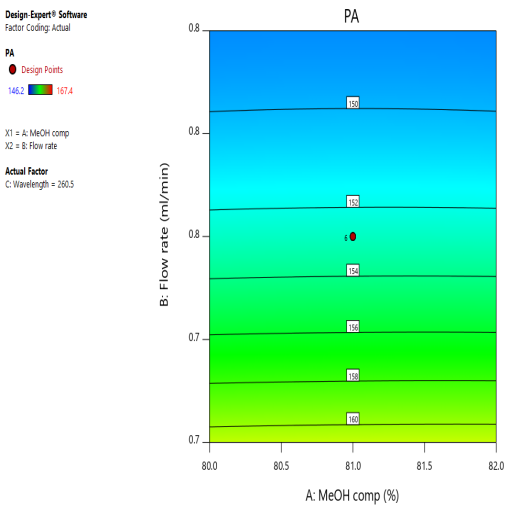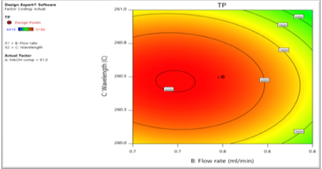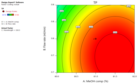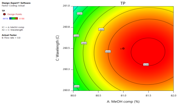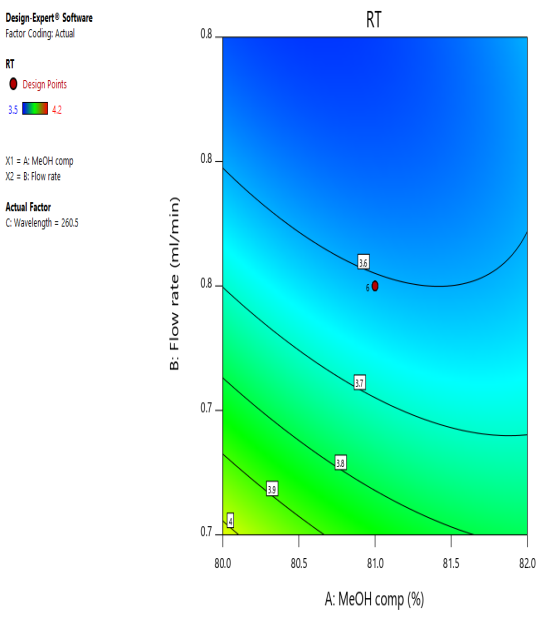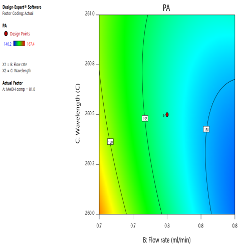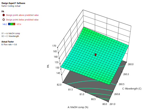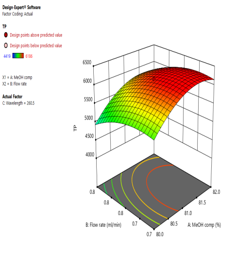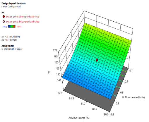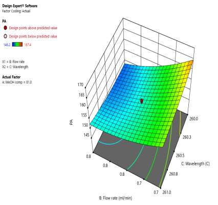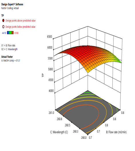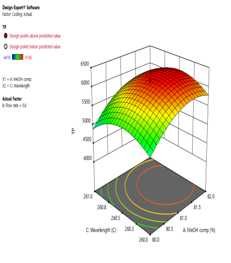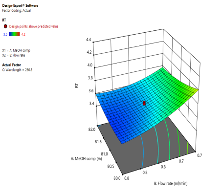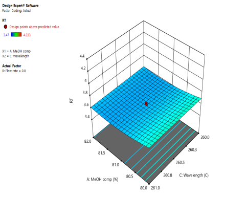 A Central Composite Design for response surface methodology was applied for the optimization of analytical variables. Methanol composition (X1), flow rate (X2), and wavelength (X3) were taken as independent variables, while Retention time (Y1), Peak area (Y2), and Theoretical plates (Y3) as depicted in table 2 were taken as dependent variables to study 3D response surface and contour plots. Effects of independent variables on dependent variables were studied to evaluate the quality target method profiles (QTMP), which was relative resolution time (RRT). Centre composite design that involved 20 runs, these experiments were performed and the results are summarized in table 2.