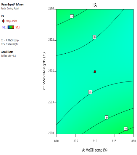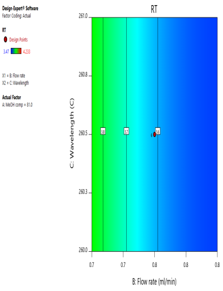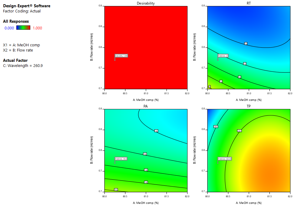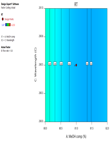 The chromatographic conditions were optimized for the determination of LPT within a lesser analysis time (<4 min). Predicted mean variables for optimized chromatographic conditions with the desirability of 1.000 as shown in fig. 5, that is consist of confirmation location Methanol 81%, a flow rate of 0.7 min, and wavelength of 261 nm. Statistical parameters are as shown in table 4 with 95% confidence. Predicted mean responses were validated with actual responses.
