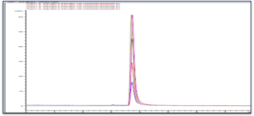 HPLC chromatogram of LPT is shown in fig. 6(A) and an overlay of the chromatogram corresponding to the linearity concentration range of LPT is depicted in fig. 6(B). Linear calibration curves (n=3) were obtained by plotting peak areas of LPT versus concentration at five levels (10, 20, 30, 40, and 50µg/ml) each in triplicate, as shown in fig. 7. Three correlation coefficients of R21 =0.9988, R22 =0.9990 and R23 = 0.9992 were obtained with relative standard deviation (RSD %) values between 0.58 and 0.59%. The regression equation for the calibration curve was typically calculated to be y = 13.07x+4.72 in which y is the peak area and x corresponds to the LPT concentration.