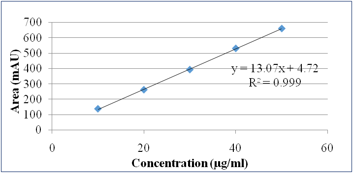 Linearity is the ability of the analytical procedure to obtain a response that is directly proportional to the concentration (amount) of the analyte sample. The method is linear when test results show proportionality concerning the concentrations. The linearity was performed by preparing the five different concentrations of LPT as 10, 20, 30, 40, and 50μg/ml, respectively. Linearity arrangements were infused in triplicate. The test results obtained here are directly proportional to the analyte samples of LPT. Linear calibration curves were obtained by plotting mean peak areas of LPT on Y-axis versus the respective concentrations on X-axis at five levels each in triplicate. Linearity was determined by least squares linear regression analysis of obtained calibration curves for five points [36, 37]. The linearity was measured by linear regression analysis.