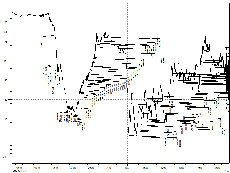 FTIR was performed and the FTIR spectrum of pure drug MNX, pure drug TFC, physical mixture of the pure drugs and their physical mixture with the polymers i.e. (MNX-TFC-carbopol 934-HPMC K4m) and (MNX-TFC-carbopol 934-HPC) are shown below in fig. 12, 13, 14, 15 and 16 respectively. Comparison was established between the obtained frequency and the standard functional group frequencies of MNX and TFC. The peaks obtained in the IR spectrum of a physical mixture of drugs and excipients had similar peaks as that of the standard. IR spectrums obtained were superimposing on each other, which concludes that there are no interactions between the drugs and polymers there by the drugs and polymer was compatible with each other. The frequencies corresponding to the functional groups are shown in table 5, 6, 7, 8 and 9.