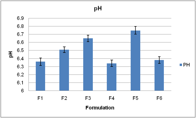 Fig. 10: Graph for pH of gel formulations (F1-F6) (n=3) (mean±SD)