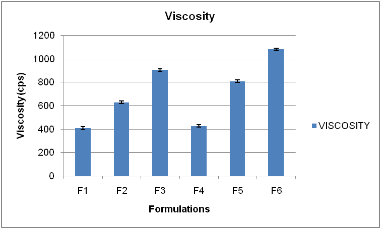 Fig. 11: Graph for viscosity (cps) of gel formulations (F1-F6) (n=3) (mean±SD)