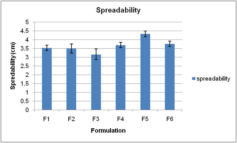 The spreadibility of the formulated gels was found to be in the range of 3.5 to 4.3 cm and were found to be satisfactory and within the limit. The results are shown in the form of mean±SD in table 3.