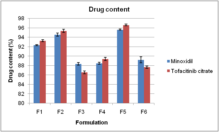 The optimized formulation F5 was used to perform stability studies. The stability study was carried out for two months at accelerated condition i.e. 40 °C±2 °C/75±5% RH. The evaluation parameters considered were physical appearance, pH, viscosity and drug content of Minoxidil and Tofacitinib citrate. The samples were withdrawn after every 15 d and evaluated for the above said parameters in triplicates [15, 17].