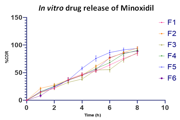 Fig. 14: In vitro drug release of Minoxidil from formulations F1-F6 (n=3) (mean±SD)