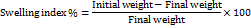 The prepared tablets were taken in a beaker containing 150 ml of 0.1 N HCl. Tablets were weighed before placing in the beaker (which was taken as the initial weight). After 12 h the swelled tablets were taken out and weighed after blotting at 12 h [11]. The swelling index was calculated using the formula