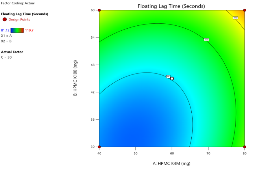 Fig. 3: Floating lag time contour plot of levofloxacin floating tablets (HPMC K4M vs HPMC K100M)