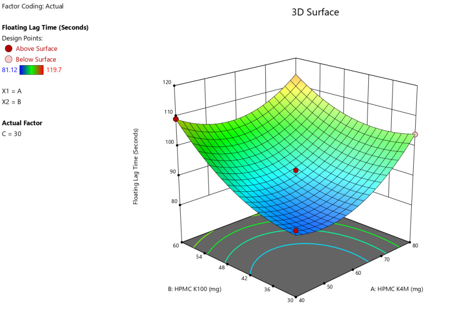 Fig. 3.1: Floating lag time 3D surface plot of levofloxacin floating tablets (HPMC K4M vs HPMC K100M)