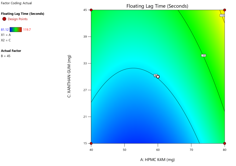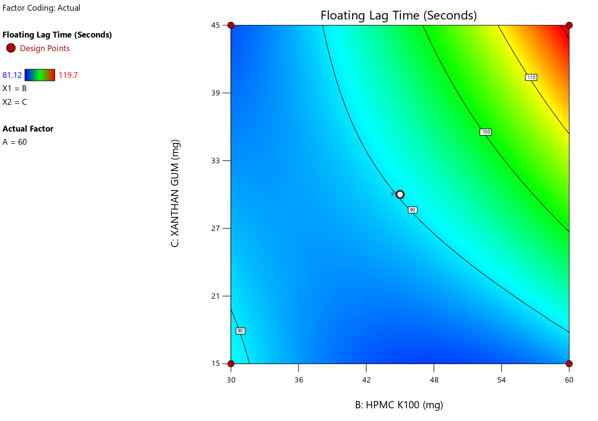 Fig. 5: Floating lag time contour plot of levofloxacin floating tablets (HPMC K100M vs Xanthan gum)