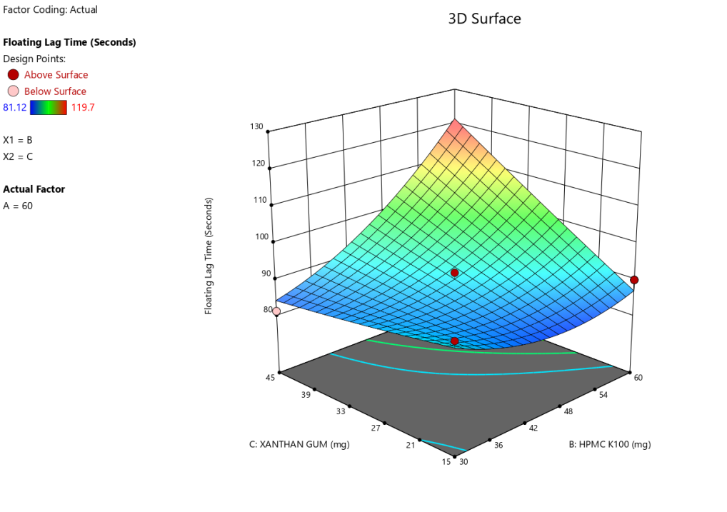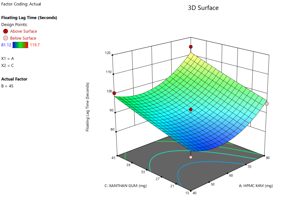 Fig. 4.1: Floating lag time 3D surface plot of levofloxacin floating tablets (HPMC K4M vs Xanthan gum)