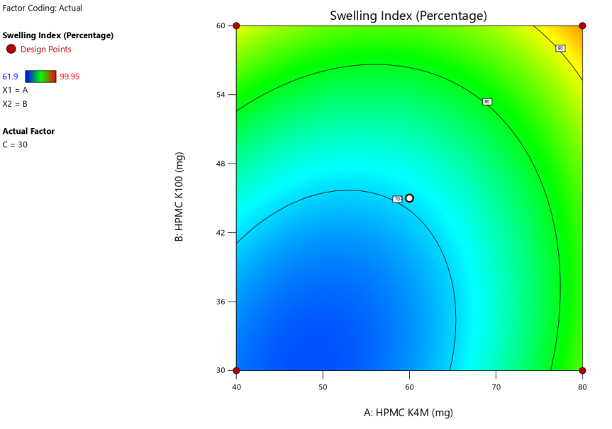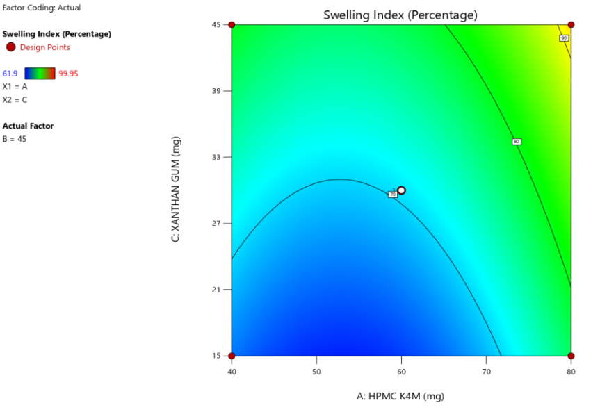 Fig. 6: Swelling index contour plot of levofloxacin floating tablets (HPMC K4M vs HPMC K100M)