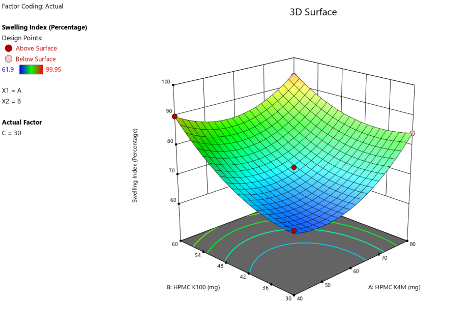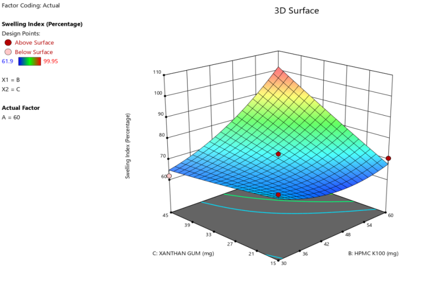 The model was found to be significant (F value = 19.05: P value<0.05. The value predicted 0.5932and adjusted R2 value 0.9207 is reasonable agreement. Adequate Precision measures the signal-to-noise ratio is required. This ratio greater than 4 is desirable. The obtained ratio of 13.383 indicated an adequate signal. From the polynomial equation, it is clear that A, B, C influence the swelling index. The positive sign of independent variables (A, B, C) clearly indicated that the swelling index was increase with an increase in polymer concentration.